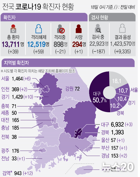 이날 0시까지 격리해제된 환자는 59명 늘어 총 1만2천519명이 됐다. 격리치료 중인 확진자는 21명 줄어 898명이다.