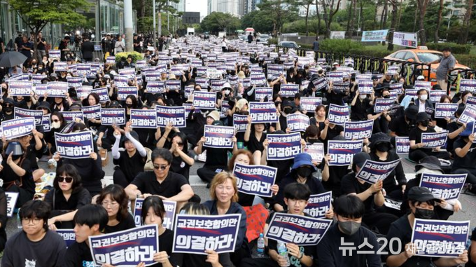 지난 4일 오후 서울 영등포구 국회의사당 앞에서 열린 서이초 사망교사 49재 추모 집회에서 참가자들이 구호를 외치고 있다.
